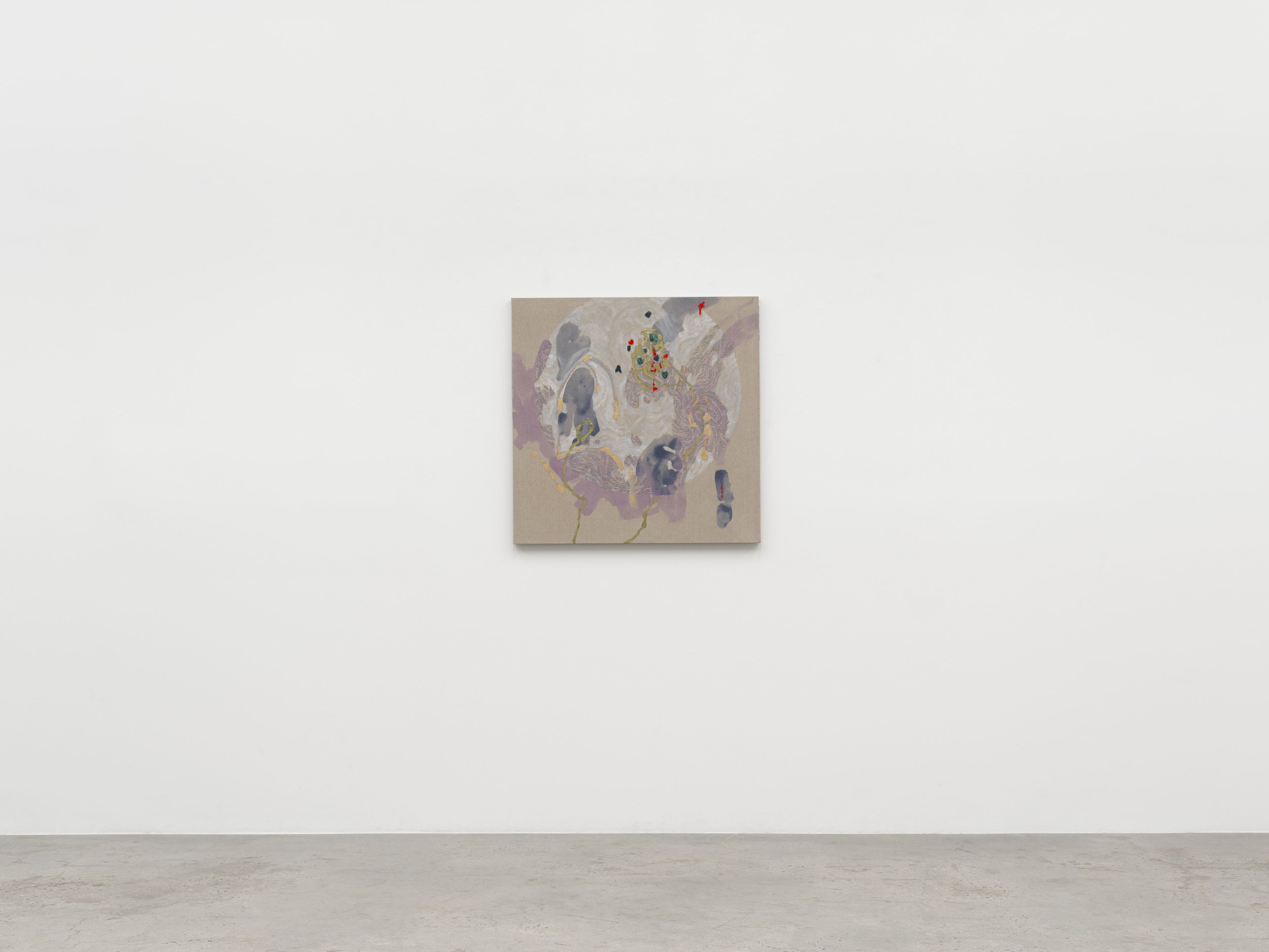 In 2016, Rankin turned exclusively to painting, combining gestural abstraction with the sewn mark on raw canvas. While her embroideries can be read within a history of landscape painting, Rankin's paintings can be situated within the ongoing trajectory of painterly abstraction. Expressive and emotive, they offer a visual encounter that is both fast and slow, contrasting areas of rest for the eye with spontaneous, intuitive mark making. The controlled interplay of dual mediums across the pictorial space creates a tension, in which paint and thread connect, respond and erase each other.